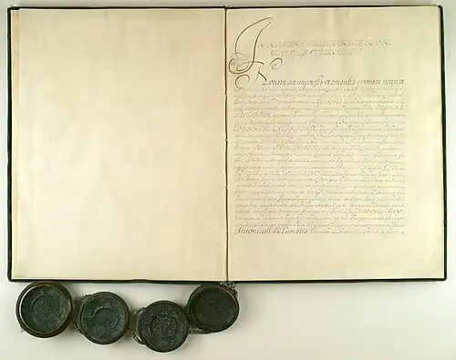 The signatories were the Habsburg Holy Roman Emperor Leopold I, Elector Frederick William I of Brandenburg and King John II Casimir Vasa of Poland. Magnus Gabriel De la Gardie, the head of the Swedish delegation and the minor regency, signed on behalf of his nephew, King Charles XI of Sweden, who was still a minor.[7]