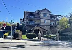 Due to the constraints of the terrain, there are only two roads leading into the historic district. Main Avenue connects to the center of Downtown Spokane from the east while Clarke Avenue runs west into the rest of the Peaceful Valley neighborhood and provides access to the adjacent West Hills and Browne's Addition neighborhoods.[4] A staircase connects Peaceful Valley with downtown, specifically the also-NRHP-listed Riverside Avenue Historic District, at Cedar Street.[5][3] Just west of that staircase, the Maple Street Bridge crosses over the gorge right through the heart of the district, connecting Downtown and the rest of the south side of the city with the West Central neighborhood and the rest of the north side.[4]