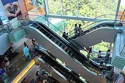 The building was altered from 2005–2006 at a cost of $100 million.[12][13] The lower portion was glassed in to increase retail space, and the escalators were relocated. The Peak Tower now has eight floors with the viewing terrace relocated to the top of the building (at the top of the 'wok' shape) that overlooks both Victoria Harbour and Aberdeen (SW of the Hong Kong Island); however, severe air pollution often hinders the outlook from this venue.