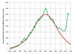 By observing past discoveries and production levels, and predicting future discovery trends, the geoscientist M. King Hubbert used statistical modelling in 1956 to predict that United States oil production would peak between 1965 and 1971.[121] While this prediction held for many decades,[122] more recently as of 2018 daily oil production in the United States had finally exceeded its previous peak in 1970.[123][124] Hubbert used a semi-logistical curved model (sometimes incorrectly compared to a normal distribution). He assumed the production rate of a limited resource would follow a roughly symmetrical distribution. Depending on the limits of exploitability and market pressures, the rise or decline of resource production over time might be sharper or more stable, appear more linear or curved.[125] That model and its variants are now called Hubbert peak theory; they have been used to describe and predict the peak and decline of production from regions, countries, and multinational areas.[125] The same theory has also been applied to other limited-resource production.