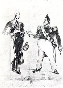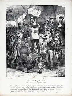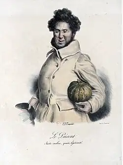 Charles Philipon was born in Lyon in 1800, the son of a wallpaper merchant. At the age of 23, he moved to Paris to pursue an artistic career.[47] To support himself, he initially worked for image makers on Rue Saint-Jacques and for manufacturers of labels and rebuses, illustrating numerous affordable story sheets.[48] From 1824 onward, he began studying lithography[49] while specializing in producing individual works, which were sold as separate sheets.[50] His early works were focused on popular subjects, including fashion series, caricatures of manners, and comic advertisements, although they did not stand out as exceptional.[51]