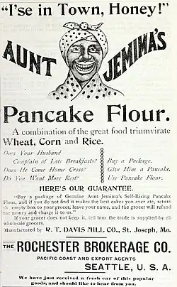 To distinguish their pancake mix, in late 1889 Rutt appropriated the Aunt Jemima name and image from lithographed posters seen at a vaudeville house in St. Joseph, Missouri.[1][7] However, Rutt and Underwood could not raise enough capital and quickly ran out of money.[1] In 1890, they sold their Aunt Jemima Manufacturing Company to the Randolph Truett Davis Milling Company[1] (also in St. Joseph, Missouri), then the largest flouring mill on the Missouri River, having an established reputation with wholesale and retail grocers throughout the Missouri River Valley.[2][8]