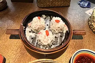 The meat mixture is formed into balls, then rolled and coated in glutinous rice, which is soaked beforehand but not cooked.[1] The balls are then steamed and served in bamboo steamers.