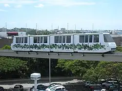 One of Pearlridge's most distinctive landmarks is the Skycab, Hawaiʻi's only monorail system. Connecting both Uptown and Downtown, it provides a unique transport and a notable focal point of the center. Rides cost $1.00 one way.[5] The monorail first ran on November 7, 1977, and was built by Rohr Industries.[6]