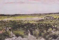 Peasant Man and Woman Planting Potatoes (F129a) is a spring-planting painting of a man and woman working together. He turns the earth with a spade and she plants the potato seed. The figures of both sit below the horizon, symbolic of their connection to the earth. The painting was made in Nuenen, within the North Brabant district where Van Gogh was raised. Two weeks after completing this painting, Van Gogh completed his best known painting, The Potato Eaters. Potatoes were a staple in the diet of the poor peasants, those who could barely afford bread, and meat was a luxury. Potato was a food not fit for those who could afford better in the 19th century. Thomas Carlyle, a Scottish philosopher, deemed the poor "root-eaters". Van Gogh may have been inspired by the description of Jean-François Millet's biographer, Alfred Sensier of Potato Planting: "one of his [Millet's] most beautiful works" of a married couple "on a wide plain, at the edge of which is a village is lost in the luminous atmosphere; the man opens the ground and the woman drops in the seed potato."[45]