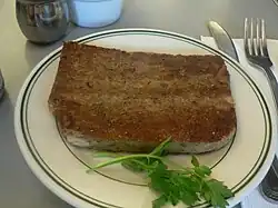 Ground meat or meat scraps mixed with grain in approximately equal proportions, then often formed into a loaf, sliced, and fried