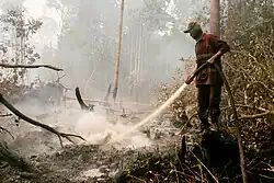 Peatland degradation, through exposure and increased dryness of landscapes, increases risks of fire. Peatland fires (dominantly caused by deforestation, human error or exposure) has led to immediate and longterm effects.[31] Primarily, immediate risks of death and loss of land. Secondly, the effect of hazes or smoke from fires can create longterm health impacts, particularly respiratory issues.[14][32] Tackling effects of fires and assisting peatland stability and restoration assist human health and lives as well as reducing habitat fragmentation and assisting recovery of ecosystems and plant within these landscape.