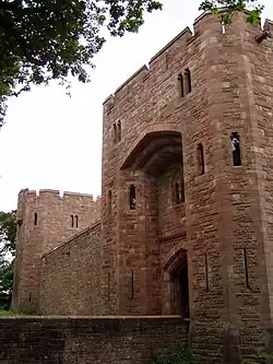 The entrance lodge to the southeast of the castle is also listed at Grade II*. It was designed by Salvin and is constructed in red brick and stone with a tile roof. It consists of an archway with a round turret behind and a two-storey lodge to the left.[13]