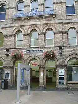Rye Lane, Peckham's main shopping area shown where it runs perpendicular to Peckham Rye railway station.
