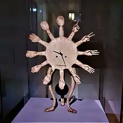 Friedeberg has painted, created murals for institutions in Mexico and abroad, illustrated books and book covers, created furniture and set designs.[8] He was the art director, along with Sergio Villegas of a spectacular called Arbol de la Vida.[3] He began designing furniture in the 1960s, rejecting the then-dominant international style of architecture. He has designed chairs, tables, couches and love seats in fantastic designs.[1][3] He is best known for his hand-chair, which has sold more than 5,000 copies since it was created in 1962.[5] The original chair was made of wood and covered in gold leaf.[9][10] It is designed to allow one to sit on the palm, using the fingers as a back and arm rest.[3] He has declared that he is never really relaxed and stated that he has painted one canvas per week, 52 weeks a year for the fifty years of his career in addition to sculptures and chair designs.[6] His paintings, sculpture and furniture was very fashionable, called “chic” in the 1960s and 1970s.[2]