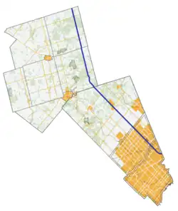 Airport Road begins at Highway 427 in Mississauga, initially tracing a broad curve as a continuation of Toronto's east–west Dixon Road near the main street entrance of Pearson Airport to the west. Shortly after, it passes both over and under Highway 409 and its complicated ramps that serve as the airport's freeway access. Just to the north it passes under the elevated tracks of the Union Pearson Express, an airport rail link running to Downtown Toronto, and the guideway of the Terminal Link, the airport's automated people mover. It then straightens to join the main road grid and runs northwest, passing the operations centre for Air Canada, the airport's cargo facilities, and the east end of Runway 36R, a popular location for planespotting.[3] At Derry Road, the street enters the Malton neighbourhood, dipping under the tracks hosting GO Transit's Kitchener Line commuter trains just north of the intersection. It enters Brampton, south of Steeles Avenue and then interchanges with Highway 407 (Exit 53). Airport Road continues through more industrial areas, passing under the rail spur serving the Brampton Assembly (Stellantis Canada) auto plant. At Bovaird Drive, it forms the boundaries of two residential districts; Springdale and Castlemore, and at Mayfield Road enters the largely rural Town of Caledon, although a suburban warehouse district is under development for a short distance north of Mayfield.[4]