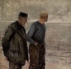 A big and simple fisherman and boatbuilder, Ham Peggotty is the orphaned nephew of Clara and Daniel Peggotty and is the fiancé of Emily, to whom he became engaged on the visit of David Copperfield and Steerforth to the boat house at Great Yarmouth. He drowns trying to rescue Steerforth during a storm at sea off Yarmouth.[5] "He was a huge, strong fellow of six feet high, broad in proportion, and round-shouldered; but with a simpering boy's face and curly light hair that gave him quite a sheepish look. He was dressed in a canvas jacket, and a pair of such very stiff trousers that they would have stood quite as well alone, without any legs in them. And you couldn't so properly have said he wore a hat, as that he was covered in a-top, like an old building, with something pitchy."