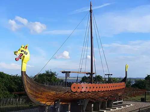 A full-size replica Scandinavian longboat complete with shields is situated by the main road on the low clifftops above Pegwell Bay to commemorate the first Anglo-Saxon landings in England hereabouts. The replica, named Hugin, sailed from Denmark to Thanet in 1949 to celebrate the 1,500th anniversary of the Anglo-Saxon invasion of Britain, the traditional landing of Hengist and Horsa, and the betrothal of Hengist's daughter, Rowena to Vortigern, King of the Britons. Out of 53 crewmen only the navigator, Peter Jensen, was a professional seaman. Historic conditions were faithfully observed but with the addition of a sextant. The Hugin was offered as a gift to Ramsgate and Broadstairs by the Daily Mail in order for it to be preserved for centuries. The ship underwent extensive restoration in 2004–5.[3][4]