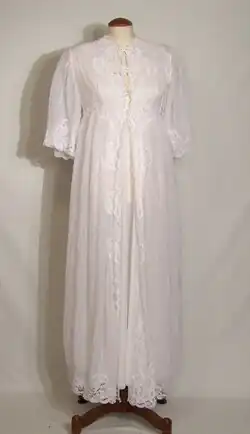A peignoir (/ˈpɛnwɑːr, ˈpeɪnwɑːr/ PEN-war, PAY-nwar, US also /pɛˈnwɑːr, peɪˈnwɑːr/ pen-WAR, pay-NWAR,[1][2][3] French: [pɛɲwaʁ] ⓘ) is a long outer garment for women which is frequently sheer and made of chiffon or another translucent fabric. The word comes from French peigner 'to comb [hair]' (from Latin pectināre, from pecten 'comb') describing a garment worn while brushing one's hair, originally referring to a dressing gown, bathrobe or lounging robe.