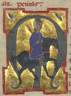 Peirol was originally a poor knight, described as "courtly and handsome" by the author of his late thirteenth-century vida (biography).[12][13] He served at the court of Dalfi d'Alvernha, but was in love with his sister Salh (or Sail) de Claustra (which means "fled from the cloister"), the wife of Béraut III de Mercœur,[11] and wrote many songs for this "domna" (lady). While Dalfi had brought his sister to his court for Peirol and had helped Peirol cater to her tastes in his compositions, eventually Dalfi grew jealous of the attention his sister gave Peirol and, in part because of the impropriety, had to dismiss Peirol, who could not support himself as a man-at-arms.[11] His biographer indicates, Peirols no se poc mantener per cavallier e venc joglars, et anet per cortz e receup dels barons e draps e deniers e cavals.[4] That is: Peirol being unable to maintain himself as a knight became a jongleur, and travelled from court to court, receiving from barons clothing, money, and horses.