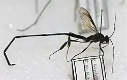 The genus Pelecinus is the only living member of the family Pelecinidae (there are also many fossil genera),[1] and contains only three species, restricted to the New World. One species, Pelecinus polyturator, occurs from North through South America, and the others occur in Mexico (Pelecinus thoracicus) and South America (Pelecinus dichrous). The females are glossy wasps, very long (up to 7 cm) and the abdomen is extremely attenuated, used to lay eggs directly on scarab larvae buried in the soil.[2]