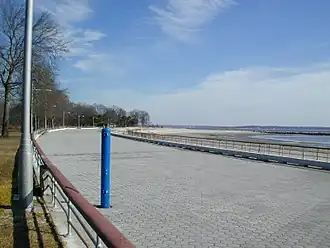 A final design for the beach was unveiled in July 1935.[84][85][86] The beach project involved filling in approximately 110 acres (45 ha) of LeRoy's and Pelham Bays with landfill,[3] followed by a total of 4,000,000 cubic yards (3,100,000 m3) of sand.[87][88] Moses thought that waste from the New York City Department of Sanitation would be cheaper than sand.[87] In early 1935, workers began placing the garbage fill[89] around Rodman's Neck, Twin Island, and Hunter Island.[89][90] After the garbage began washing onto the beach, the rest of the site was filled-in using sand starting in 1936.[87][91] The beach, designed by Gilmore David Clarke and Aymar Embury II, was dedicated in July 1936[74][90] despite only being partially complete.[92][93] The beach officially opened on June 25, 1937.[94] Soon after Orchard Beach opened, it was expanded, starting with the southern locker room in 1939.[95][96] The water between Hunter and Twin Islands was filled in during 1946 and 1947, with new jetties at each end of the beach. The promenade was extended over the fill and opened in 1947,[97][72][68][98] Further improvements were made to the bathhouse pavilion in 1952 and to the northern jetty in 1955. A new concession stand was added north of the pavilion in 1962,[97] and a privately funded Golf driving range was also added that year.[99] The beach was renovated starting in 1964.[100]