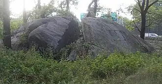 Split Rock (40°53′11″N 73°48′54″W / 40.88648°N 73.81492°W), a large dome-shaped granite boulder measuring approximately 25 feet (7.6 m) from north to south and 15 feet (4.6 m) from east to west, is located at the intersection of the New England Thruway and Hutchinson River Parkway, on a triangular parcel of land formed by these roads and a ramp that leads from the northbound Parkway to the northbound Thruway.[169] The only public access to the rock is by a pedestrian trail that begins on Eastchester Place, outside the park. The Bridle Trail passes close to the rock, but is separated from the rock by the parkway's exit ramp.[135] Another park trail, called the Split Rock Trail, leads from the Bartow Circle to the rock.[170]