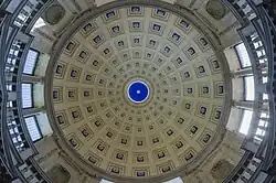 The coffered dome with rosettes on a blue background, surmounted by a lantern, covers the chapel;[22] the effect given by the color makes the interior space look majestic while the plasticity of the decorations is enhanced by the light that penetrates from the lantern and the stained-glass windows of the drum, giving the monument as a whole a striking elegance.[15] The dome with drum, present here for the first time, became a Sanmichelian stylistic feature, as can be seen in the domes of the church of Madonna di Campagna, San Giorgio in Braida and the temple of Lazzaretto.[23]