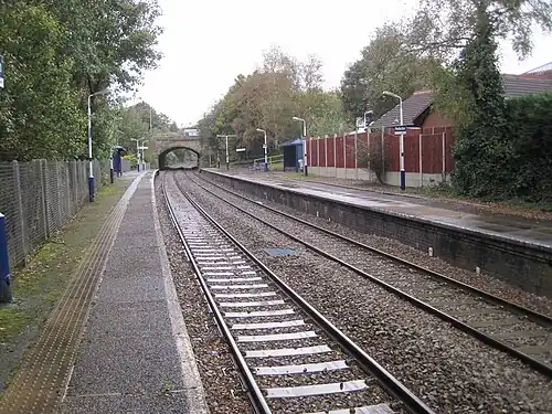 The station was opened on 20 November 1848 by the Liverpool and Bury Railway.[1] It on the A571 Billinge Road. The platforms are at the bottom of two ramps (one on each side) which until recently was cobbled on the Kirkby bound platform. Once on the platform, the line underneath the bridge is obscured by overgrown trees.