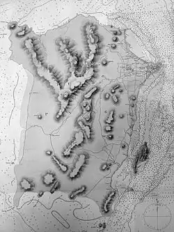 The island's terrain is irregular and consists of a hilly and mostly forested interior. The coastal plains are narrow, with the most expansive one being at the northeastern cape.[2] It was at this cape where the early development of George Town began, eventually reaching down the eastern seaboard. Mangrove swamps are prevalent along the western shoreline of the island. Combined with the hills at the centre of the island, urbanisation along the western half of the island has been limited.