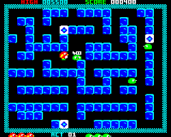 The maze is inhabited by deadly "snow bees". They move in a semi-random way: a bee may sometimes choose to get away from Pengi instead of chasing him (especially on early levels). The bees can be killed by crushing them with a moving ice block (bees do not stop the blocks so more than one bee can be killed with one kick) or by kicking the fence while they are touching it. This momentarily stuns them and they can be crushed by simply walking over them. Only a set number of bees are on the screen at once (e.g. 3 on level 1) but there are more (a total of 6 on level 1) which emerge from the diamond blocks as others are killed. A level is completed either by killing all of the bees or by lining up the special diamond blocks. This is the preferred way of completing the level because a huge points bonus is awarded (5,000 if they are touching the fence, 10,000 if they are not).
