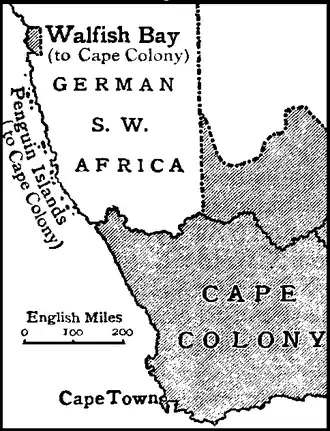 British interference and the resulting breakdown in relations between the British Empire and the local Cape government obstructed the Commission's work long enough for Germany to declare South West Africa a German protectorate in 1884 as part of the continent-wide Scramble for Africa. The offshore islands (and Walvis Bay) were excluded from German administration by their status as Cape constituencies.[4] This status was recognised by Germany in 1886. Thus, although close to the mainland, the islands were not part of German South West Africa.[5]