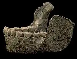 The Peninj Mandible(Peninj 1), also called Natron mandible,[1] is the fossilized lower jaw and teeth of an australopithecine specimen, likely that of Paranthropus boisei[2] or a similar population.[3] It was discovered in West Lake Natron,[4] in Ngorongoro District of Arusha Region of Tanzania by Kamoya Kimeu,[5][6] Glynn Isaac, and Richard Leakey in 1964.[7]