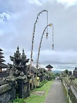 A penjor (Balinese: ᬧᬾᬜ᭄ᬚᭀᬃ) is a Balinese Hindu religious symbol of prosperity installed on the day of the Galungan ceremony. Its form is of a tall, decorated bamboo pole and can be seen across Bali year-round in front of homes, compounds and are part of temple anniversary celebrations as well almost every other important religious ceremony and Hindu life-cycle rituals.[1]