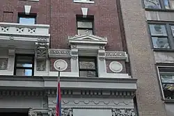 The lowest portion of the facade contains a water table of granite, above which the first two stories are clad with rusticated limestone blocks. The main entrance is at the center of the facade and is accessed by a short granite stoop with granite walls on either side. The doorway contains a set of metal-and-glass double doors, topped by a metal grille, and is surrounded by bosses. Above the main entrance is an entablature with brackets; originally, the center of the entablature contained a cartouche with Yale University's shield.[17] To the right of the main entrance was a window that illuminated the basement, while to the left was a doorway to the basement; both were topped by sash windows at the first story. In the early 1990s, metal doors were installed at ground level in both bays, with pediments, lighting fixtures, and metal screens above the doors. Above the doorways are voussoirs; the center voussoir contains a round disk with foliate motifs on either side.[17]