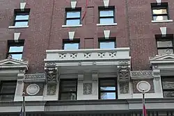 On the third to eighth stories, the facade is made of red brick with Flemish bond, and there are terracotta decorations. On the third story, the two center bays contain decorative panels on either side, and there is a balcony with ornate brackets directly above these windows. The outer bays on that story contain windows, flanked by pilasters and topped by pediments with corbels and anthemia. There are round disks on either side of the outermost windows on the third story, as well as decorative horizontal bands above these disks. On the fourth through seventh stories, the lintels above each window are composed of brick voussoirs that flank a terracotta keystone. At the seventh story, the windows in the outer bays are flanked by brackets shaped like lions' heads; these brackets support small balconies in the eighth story's outer bays. The lintels above the eighth-story windows are made of terracotta, and there are cartouches with foliate decorations at the center of each eighth-story window. A molded cornice, made of terracotta, runs above the eighth story.[24]