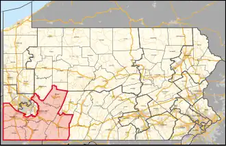 Pennsylvania's 14th congressional district is located in the southwestern part of the state and includes all of Fayette County, Greene County, and Washington County, and most of Indiana, Westmoreland, and Somerset counties. It is represented by Republican Guy Reschenthaler.[3]