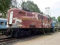 The GG1 was developed in 1930s by General Electric as the replacement for the Pennsylvania Railroad's then standard electric locomotive, the P5a, and was based largely on the New Haven EP3.[1] The GG1 was capable of a top speed of 100 miles per hour (160 km/h), powered by its twelve 385 horsepower (287 kW) traction motors. The prototype GG1, PRR 4800, was tested against Westinghouse's submission, the R1. The Pennsylvania selected the GG1 over the R1, as the R1 was not articulated and the GG1's traction motors were similar to ones already in use.[2] An order for 57 GG1s was placed in November 1934 and the first locomotives were delivered in April 1935.[3]