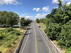 PA 10 enters Caernarvon Township in Lancaster County and descends the hill into farmland, continuing to the north and crossing the Conestoga River. The route reaches an intersection with PA 23, at which point it turns northeast for a concurrency with that route along Main Street, a three-lane road with a center left-turn lane that heads into commercial areas.[2][5] The road crosses into Caernarvon Township in Berks County and intersects SR 2089, a four-lane freeway that provides access to northbound I-176. The two routes continue into the community of Morgantown as a two-lane road and pass homes. PA 10 splits from PA 23 by turning north onto Morgantown Road, passing to the east of the Morgantown Center event facility before coming to a bridge over the Pennsylvania Turnpike (I-76). The route turns east, passing to the north of Hollywood Casino Morgantown, and comes to a partial cloverleaf interchange with I-176 that provides access to the Pennsylvania Turnpike (I-76) at the Morgantown interchange to the south.[2][6]