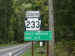 PA 233 begins at an intersection with PA 997 in the borough of Mont Alto in Franklin County, heading east on two-lane undivided Park Street. The road passes homes, becoming the border between Quincy Township to the north and Mont Alto to the south before fully entering Mont Alto again. The route heads entirely into Quincy Township as it passes the Penn State Mont Alto university campus. From here, PA 233 becomes Rocky Mountain Road South and continues near Mont Alto State Park and heads into Michaux State Forest. The route turns northeast to ascend Rocky Mountain, a part of the South Mountain range, becoming Rocky Mountain Road. The road enters Guilford Township and makes a hairpin turn to the south to descend the mountain, crossing back into Quincy Township. PA 233 curves east before heading northeast through more forests and entering Guilford Township again, where it crosses the Appalachian Trail. The route turns north-northeast and runs through more mountainous areas, heading into Greene Township. Here, PA 233 passes through Caledonia and crosses US 30 before running through forested Caledonia State Park as Pine Grove Road, turning northeast.[2][3]