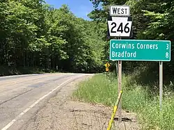Pennsylvania Route 246 (PA 246) is an 8-mile-long (13 km) state highway located in McKean County in Pennsylvania. The western terminus is at PA 46 in Corwins Corners. The eastern terminus is at PA 346 in Prentisvale.