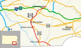 PA 272 is mostly in Lancaster County, except for about a mile at the northern terminus where it enters Berks County and the southernmost part of the route, which is in Chester County. Through the city of Lancaster, it is unsigned but concurrent with US 222.[2][3][4][5]