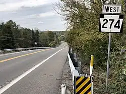 PA 274 begins at an intersection with PA 75 in the community of Doylesburg in Fannett Township, Franklin County, heading northeast on two-lane undivided Big Spring Road. The road heads through a mix of farmland and woodland with some homes before ascending forested Conococheague Mountain.[2][3] The route heads into the Tuscarora State Forest and enters Toboyne Township in Perry County and becomes an unnamed road, making a hairpin turn to the southwest before another hairpin turn to the northeast to descend the mountain, passing by Big Spring State Park. PA 274 runs through more of Tuscarora State Forest before leaving the forest boundaries and heading into open agricultural areas with some homes, passing through New Germantown. The road enters Jackson Township and becomes Mt. Pleasant Road, coming to Mt. Pleasant and becoming an unnamed road again. The route heads into the borough of Blain and passes homes, reaching an intersection with PA 17 and turns southeast onto Main Street. PA 274 curves to the east and heads back into Jackson Township, turning northeast into more open farmland as an unnamed road. The road crosses into Southwest Madison Township and curves more to the east, running through Andersonburg. The route heads through more rural areas and passes through Cisna Run and Centar. PA 274 heads through farmland with some woods to the south as it continues into Northeast Madison Township and intersects PA 850 in Fort Robinson.[2][4]