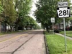 PA 281 continues through more rural areas, entering the borough of Somerset and becoming Tayman Avenue as it passes homes. At the Harrison Avenue intersection, PA 281 becomes a one-way pair concurrent with PA 31, heading east on Tayman Avenue northbound and west on West Main Street southbound, carrying two lanes in each direction. The one-way pairing becomes West Patriot Street northbound and West Main Street southbound as it heads into the commercial downtown of Somerset. PA 31/PA 281 intersect the southern terminus of PA 601, becoming East Patriot Street northbound and East Main Street southbound. PA 281 splits from PA 31 by turning north onto two-way, two-lane, undivided North Pleasant Avenue, passing between homes to the west and CSX's S&C Subdivision railroad line to the east. The route becomes the border between Somerset to the west and Somerset Township to the east, turning northeast onto Stoystown Road to fully enter Somerset Township and cross the railroad tracks (Pleasant Avenue continues north to provide direct access to PA 601 and the Pennsylvania Turnpike). The road passes through residential areas as it crosses under Interstate 70 (I-70)/I-76 (Pennsylvania Turnpike). PA 281 passes through farmland and woodland with some homes and businesses as it comes to an interchange with the US 219 freeway, becoming a divided highway at this point. Past this interchange, the road becomes undivided again and continues through more rural areas with residences, crossing the CSX line again. The route passes to the northwest of Somerset County Airport and runs through the residential community of Friedens. The road enters Quemahoning Township and runs through farmland with some woods and homes, turning north into more wooded areas and passing through Reading Mines. PA 281 continues north to its terminus at an interchange with US 30, where the road heads north into the borough of Stoystown as East Main Street.[3][5]