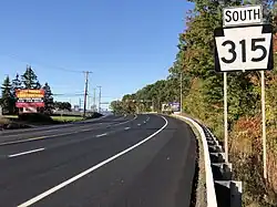 PA 315 was first designated in 1928 between PA 115 in Wilkes-Barre and U.S. Route 11 (US 11, now unnumbered Main Street) in Pittston, following Main Street between the two cities. In the 1930s, the route was moved to a multilane highway running between PA 115 east of Wilkes-Barre and US 11 in Dupont. The route was extended north along a divided highway to US 11 in Moosic in the 1950s. The northern terminus of the route was moved to I-81 near the airport in 1966, with I-81 replacing the route north of there. In the 1970s, the route begun at US 11 in Larksville and traveled through Wilkes-Barre, but was reverted by the 1980s. In the 1980s, the north end was moved to US 11 in Dupont. The south end was changed from PA 115 to an interchange with the PA 309 freeway in 1991. By 2003, PA 315's northern terminus reverted to its current location.