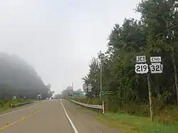 Pennsylvania Route 321 (PA 321) is a 43.8-mile-long (70.5 km) state highway located in Elk and McKean counties in the U.S. state of Pennsylvania, maintained by the Pennsylvania Department of Transportation (PennDOT). The southern terminus is at U.S. Route 219 (US 219) in the community of Wilcox. The northern terminus is at PA 346 within the Allegheny National Forest. PA 321 heads northwest from Wilcox through rural areas to the borough of Kane, where it forms a brief concurrency with US 6. North of here, the route passes through the national forest and runs along the shore of the Allegheny Reservoir. PA 321 runs east briefly with PA 59 before winding north through more forest to its northern terminus. A portion of the route along the Allegheny Reservoir is designated as the Longhouse National Scenic Byway, a Pennsylvania Scenic Byway and National Forest Scenic Byway.