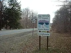 Signage for PA 321 from Kane northward had been removed by March 1966 as that section of road was under construction, with the northern terminus of the route moved to US 6 at the south end of Kane.[34][35] In April 1968, signage was installed in Kane pointing the way to the Kinzua Dam via US 6; PA 321 remained unsigned pending the completion of the road north of Kane.[36] With the construction of PA 321, the route remained unsigned north of Kane. In addition, there were a lack of signs at the PA 59 intersection pointing the way to Kane and a lack of signage in Kane directing motorists to attractions in the Kinzua Dam area. Also, a 1972 map from the Pennsylvania Game Commission incorrectly labeled PA 66 north into Kane along with the road between Kane and the Kinzua Dam area as PA 68. Plans were announced to improve signage between the two points in September 1972.[37] In June 1974, PA 321 was signed between US 6 in Kane and PA 346 near the New York border.[38] On May 7, 1990, the portion of PA 321 between Longhouse Drive and PA 59 was designated as the Longhouse National Scenic Byway, a National Forest Scenic Byway.[39]