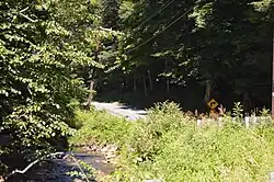 PA 326 begins at the Maryland border in Southampton Township, where the road connects to Black Valley Road and Gap Road NE south of the state line. From this point, the route heads north on two-lane undivided South Black Valley Road, passing through an agricultural valley with some woods and homes. The road curves more to the northeast, turning east onto Chaneysville Road and passing through a gap in Warrior Ridge. PA 326 reaches the community of Hewitt, at which point the road winds north through farmland and woodland in another narrow valley. The route continues through the valley for several miles, curving east before turning north onto Chaneysville Cove Road near the community of Chaneysville. The road curves northwest and passes through another gap in warrior ridge, at which point it passes through a portion of the Buchanan State Forest. PA 326 turns north onto Black Valley Road and runs through forested areas with some farms. The route bears west onto Main Road, turning west into forests and crossing Tussey Mountain. After a bend to the north, the road heads into Monroe Township and passes through more of the Buchanan State Forest.[2][3]