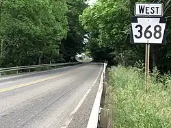 PA 368 was assigned in the mass numbering of state highways in Pennsylvania during 1928. Also, the highway extended farther than PA 58 to PA 68 in Sligo.[3] The entire highway at the time of assignment was not paved, save a couple of pieces. The highway was paved in 1930 from PA 268 in Parker to the Perryville Road intersection. However, one piece was yet to be completed.[4] In 1932, the section from West Freedom to Sligo was paved, completing the highway.[5] In 1935, the highway was realigned off Perryville Road, and onto a constructed alignment.[6][7] In 1967, the eastern terminus of PA 368 was moved from its parent route (PA 68) to an intersection with PA 58 in Callensburg.[8]
