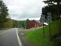 Pennsylvania Route 370 (PA 370, designated by the Pennsylvania Department of Transportation as SR 370) is a 16.73-mile-long (26.92 km) state highway located in Susquehanna and Wayne counties in Pennsylvania. The western terminus is at PA 171 in East Ararat. The eastern terminus is at PA 191 in Buckingham Township near Hancock, New York. PA 370 was first designated by the Pennsylvania Department of Highways in 1928 from the intersection with then PA 70 in East Ararat to an intersection with PA 570 in the hamlet of Preston Park (in Preston Township). The route was extended to an intersection with PA 90 (now PA 191) in 1946, when the 23-mile-long (37 km) PA 570 was decommissioned.