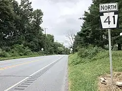 Pennsylvania Route 41 (PA 41) is a 22-mile-long (35 km) state highway located in southeastern Pennsylvania, United States. The southern terminus of the route is at the Delaware state line in Kennett Township, where the road continues as Delaware Route 41 (DE 41). The northern terminus is at U.S. Route 30 (US 30) in Gap. PA 41 runs northwest-southeast along a two-lane undivided road called Gap–Newport Pike, passing through mostly rural areas of Chester and Lancaster counties and serving Avondale, Chatham, Cochranville, and Atglen. The route serves as part of the main road linking Wilmington, Delaware, to Lancaster, Pennsylvania.