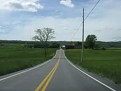 PA 643 begins at an interchange with I-70 in Brush Creek Township, heading south on two-lane undivided Old 126. The route crosses forested Town Hill before heading into agricultural areas, forking to the southeast onto Flickerville Road. The road passes through the residential community of Town Hill before ascending forested Sideling Hill. PA 643 curves northeast to reach the summit of the hill, at which point it makes a sharp turn to the south into Bethel Township to descend the hill. The road comes to the community of Sideling Hill and turns east into agricultural areas with some woods and homes. The route heads southeast before turning south and coming to its eastern terminus at US 522.[2][3]
