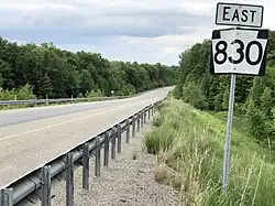 Prior to 2007, PA 830 ran further west into Washington and Pine Creek Townships.[9] The route began at US 322 near Emerickville. It had an interchange with I-80 at Exit 86 and traveled a winding route heading northeast. At Red Barn Road, it made a right turn and passed the old entrance to the DuBois Regional Airport. It made a sharp right curve at Allens Mills Road where the present routing continues today. The route between US 322 and Red Barn Road is still state-maintained as SR 1830 and the section of Red Barn Road between SR 1830 and the modern-day PA 830 is SR 1013.[3] Parts of the old PA 830 are still drivable between the PA 830 / SR 1830 intersection and Allens Mills Road, but it is not completely passable due to breaks in the pavement and the new parking lot for the airport.[2]