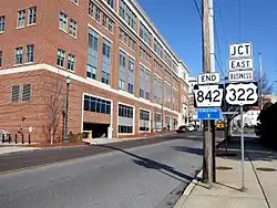 Miner Street in West Chester, which comprises part of PA 842, was laid out in 1831 as part of an expansion of West Chester built by William Everhart. The street was named for Charles Miner, a West Chester resident.[5] When Pennsylvania first legislated routes in 1911, what would become PA 842 was not legislated as part of a route.[6] PA 842 was first designated by 1928 to run from PA 82 in Unionville east to US 122/PA 5/PA 62 (now US 322 Bus.) in West Chester, following its current alignment.[7] In 1937, PA 842 was extended west from Unionville to its current western terminus at PA 841.[8][9] PA 842 has remained on the same alignment since.[3]