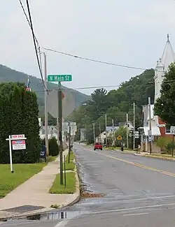 After leaving Huntersville, PA 864 turns to the southeast and enters Wolf Township. Through Wolf Township, the route remains a two-lane rural road, passing some residences before returning to dense woodlands near Lower Rynearson Road. The road makes several bends between the south and east before Laurel Run Road, where it turns to the southeast once again. The dense woods continue for another mile before PA 864 enters the borough of Picture Rocks, where it gains the moniker Laurel Run Road through downtown. The route crosses Railroad Street before intersecting with US 220 at North Main Street. This intersection serves as PA 864's eastern terminus. The right-of-way continues four blocks west to Water Street as Elm Street.[2]